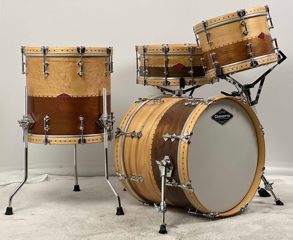 The Craviotto team crafted this unique Craftsman kit using 8 different species of wood, and the blend of wood species for each drum is intended to make the kit sonically balanced, as well as striking to look at. The 5.5x14 snare drum is ash/poplar. The 8x12 is curly maple/cherry. The 14x14 is birdseye maple/mahogany. The 14x18 bass drum is ambrosia maple/walnut. Edges are 45/45.
